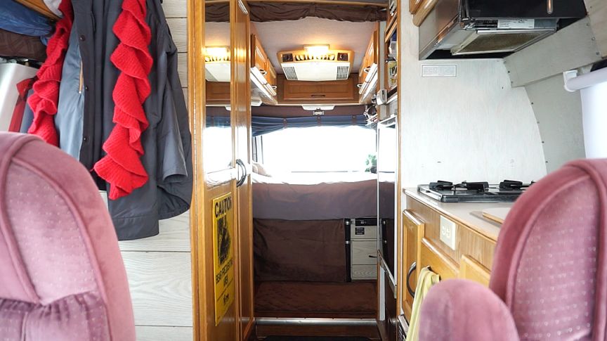 For food preparation and food storage, there is a stove and propane fridge in the tiny van.
