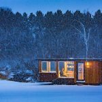 The 140 sq.ft. house features a full size stainless steel refrigerator and 12′ of countertop space. The butcher block countertop flips open to reveal a 50″ flatscreen TV.