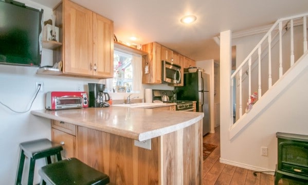 The kitchen has huge counter which also serves as the bar.