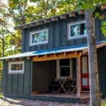 Outside the house features grey board and batten siding with white trim, a dark blue entryway door, and a 3’ Tuff Rib metal roof. The interior consists of white plywood walls in the main area and natural pine tongue and groove with clear coat in the bedroom loft.