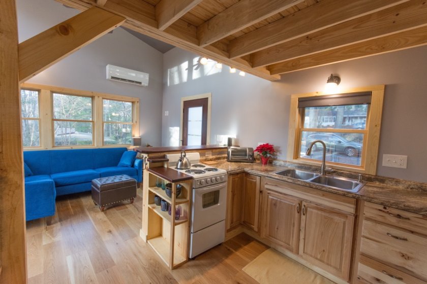 You can see a classic looking kitchen inside the Hawk Creek ADU Tiny Cabin. It is located next to the living area on the ground floor.