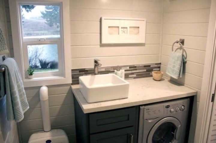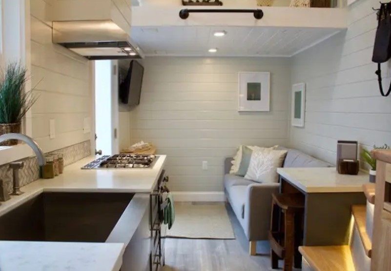 One of their clients, Karin, wanted a tiny house based off of her full sized home with the goal of travelling around the country with her grandchild. Karen got what she asked for – an amazing home with gray sidering and a lot of curb appeal.