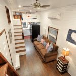The tiny house is 24′ long and wrapped in reclaimed corrugated metal siding that used to be a barn roof.