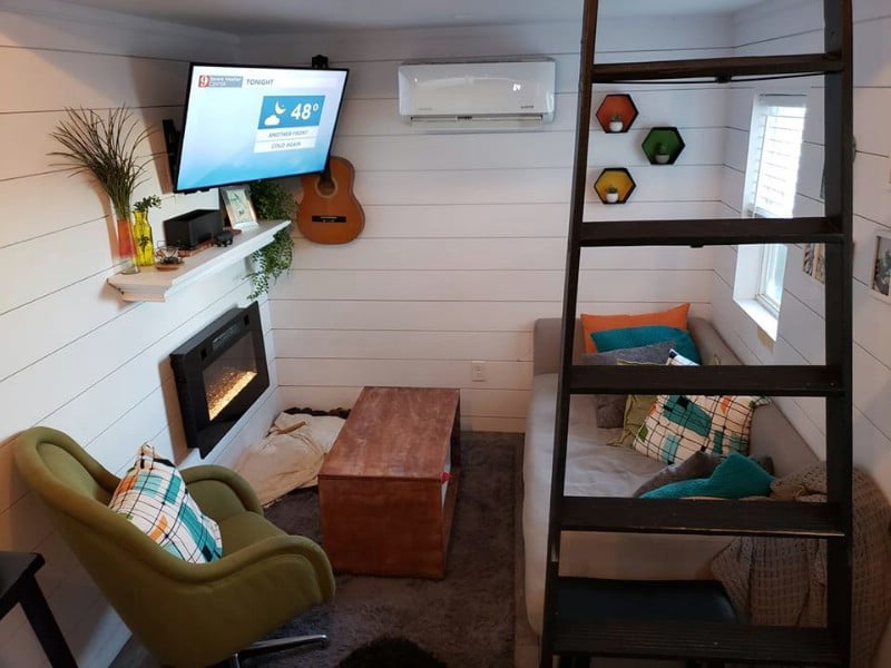 Step inside and the rhythm changes. The house opens into a bright, contemporary space that feels surprisingly expansive for its size. Two lofts float above like quiet sanctuaries — one for sleeping, one perhaps for reading, writing, or simply dreaming. The heart of the home lies in its kitchen: granite countertops smooth as river stones, a deep stainless-steel sink, and a minimalist two-burner cooktop that makes every meal an act of mindfulness. There’s even a fridge, freezer, and an electric fireplace that flickers gently in the evenings, adding that soft, amber calm.
