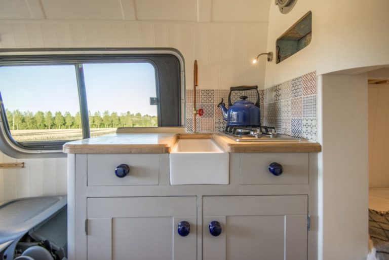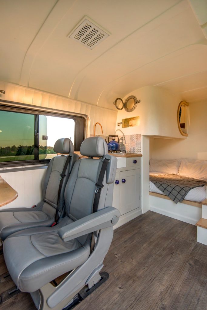 You can find an additional storage area and rear kitchen in this van converted tiny house. Moreover, you will be able to get blown air heating and hot water facilities.