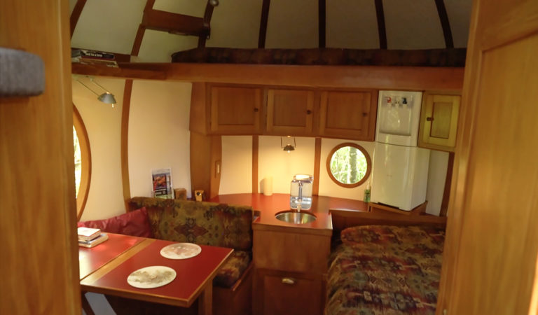 There is a murphy bed inside the sphere treehouse, which offers sleeping space for two individuals.