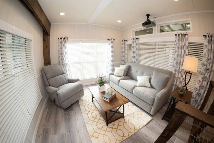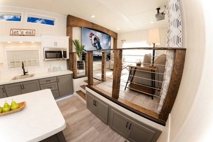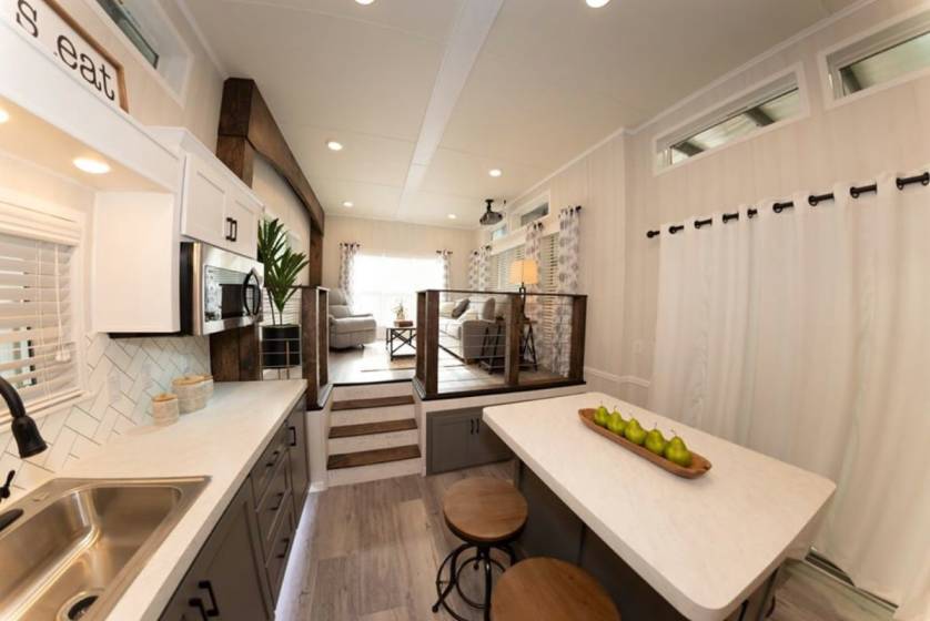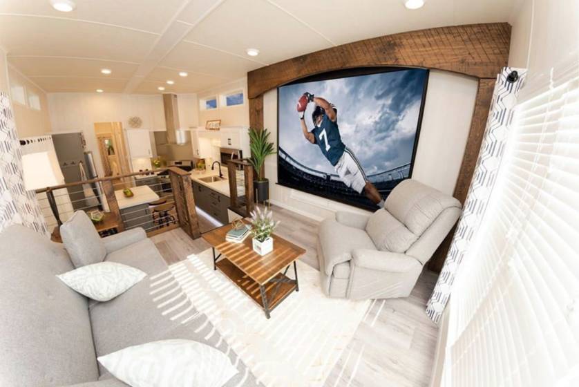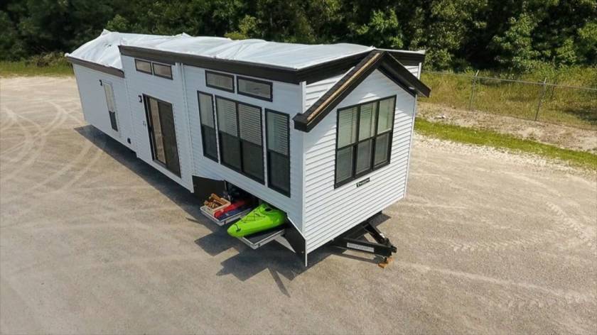 Our newest tiny home is a Woodland Park model, a house that has a basement storage feature.